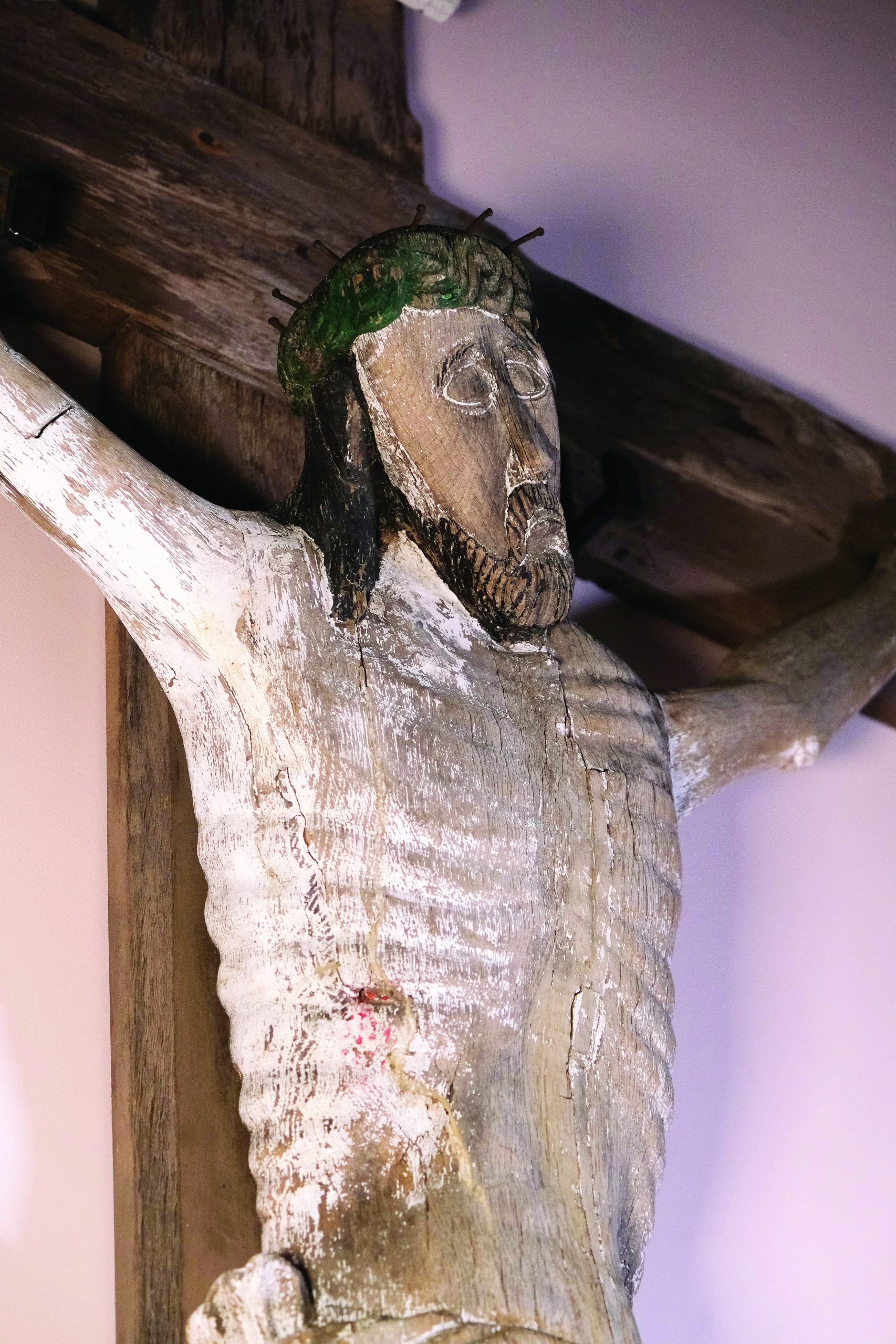 To protect the statue from the weather, a small metal roof was placed over the cross, but over time the figure of Christ deteriorated, leading to its restoration in 2022.