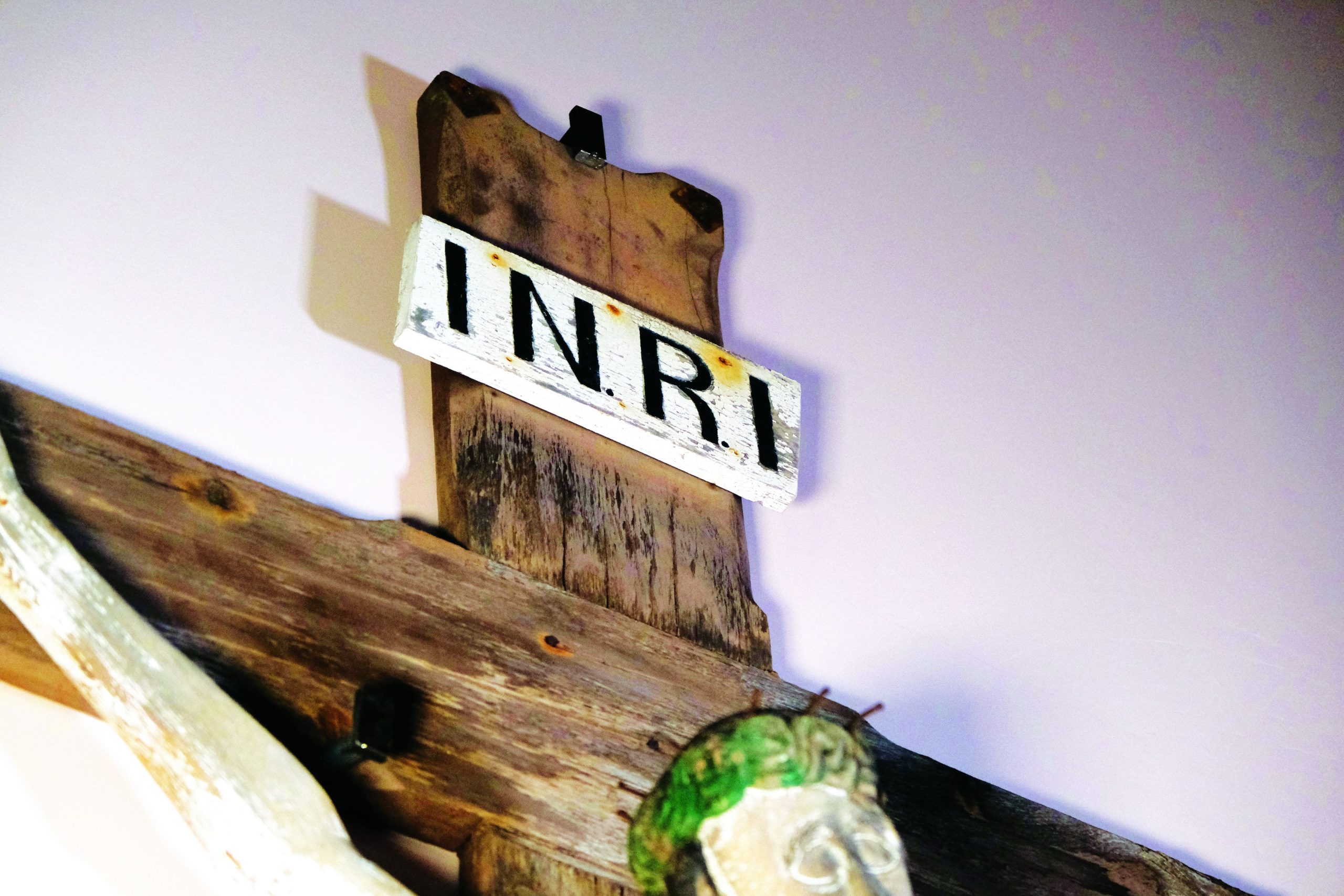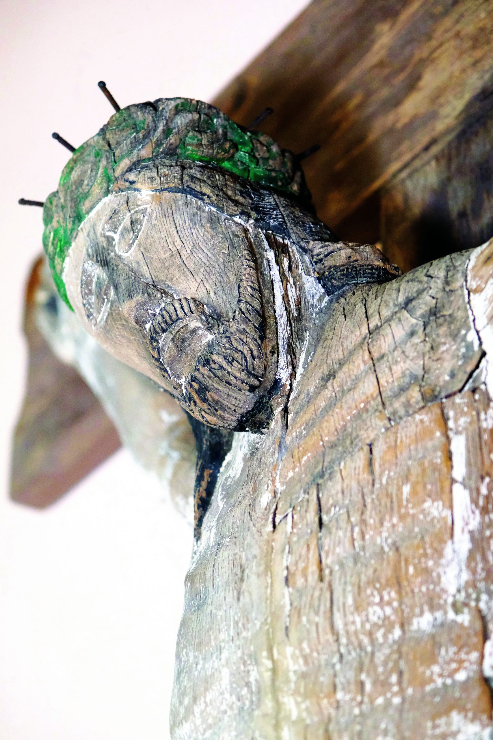 Ce Christ en croix, daté du 16e siècle, était placé à l’extérieur de l’église, à côté de l’entrée principale. Le Christ y est représenté nu, à l’exception du périzonium, un pagne. Au-dessus de sa tête, on observe une plaque avec l’inscription INRI, acronyme de Iesus Nazarenus Rex Iudaeorum (Jésus le Nazaréen, roi des Juifs).
