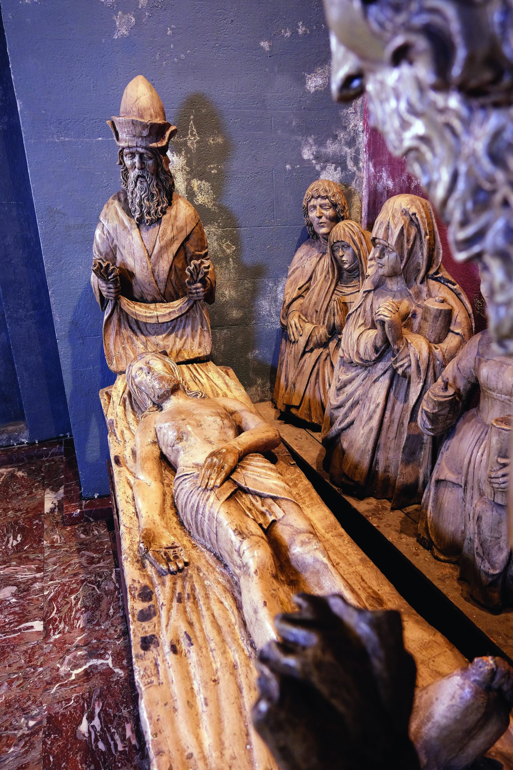 Next to the grotto, a group of sculptures represent The Entombment of Christ. The Entombment is the last stage of Christ’s Passion, the moment when his body is laid in the tomb, surrounded by his next of kin and his disciples. This work is made of carved oak and has been painted white, presumably during its restoration in 1955. This 16th century Entombment is thought to have come from the former Trinitarian convent in Bastogne, which was abolished during the French Revolution.