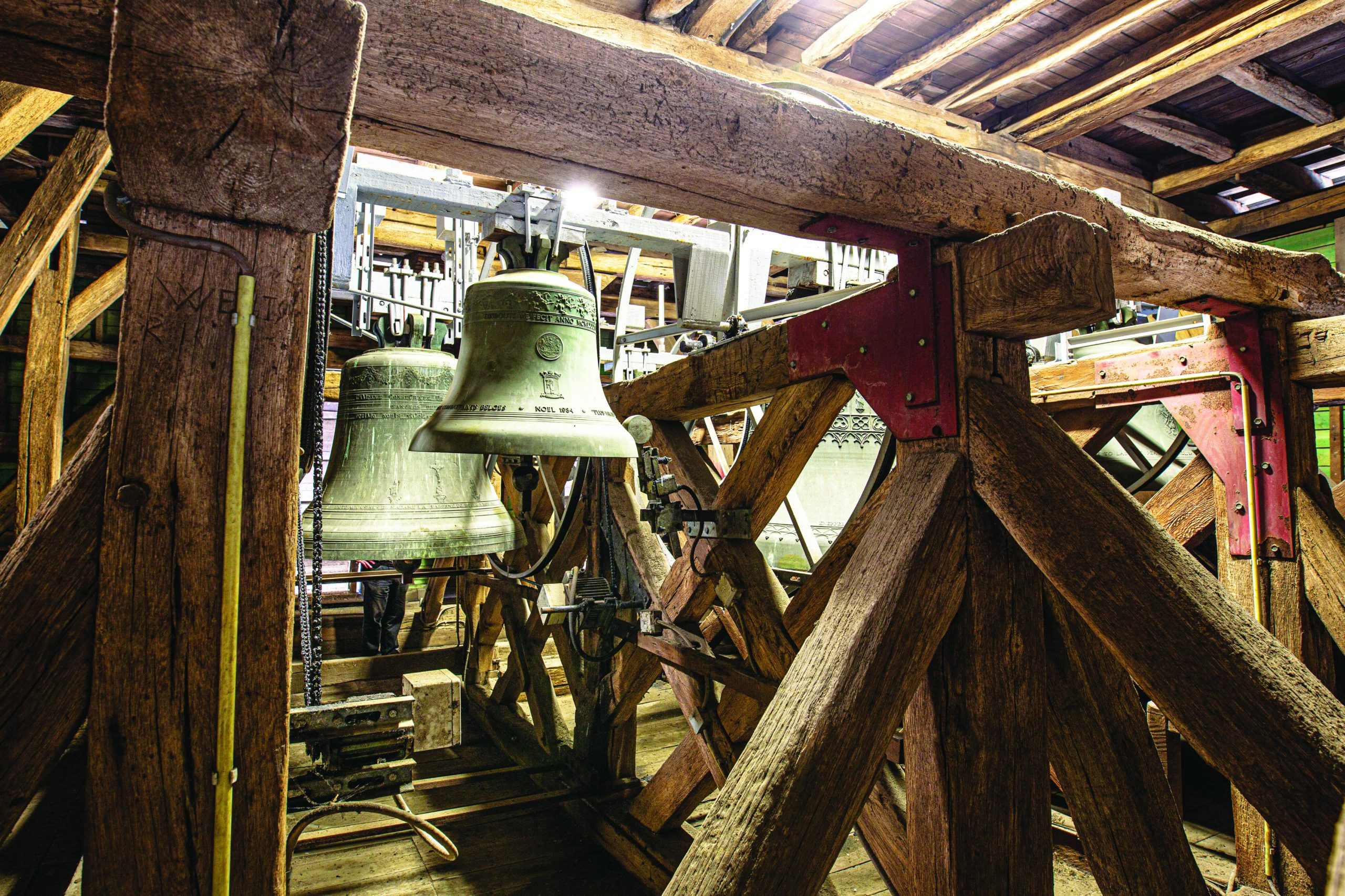 The three oldest bells have been given names, as is often the case. The first bell, the Holy Sacrament, made in 1857, weighs 690 kg. The second, the Queen of the Rosary, dates from 1893 and weighs 1,230 kg. The last and most imposing bell is the Saint Peter’s Bell, cast in 1857 and weighing 1,360 kg. Removed by the Germans during the Second World War. Luckily these bells were not lost in the armament factories but have been recovered after the war.